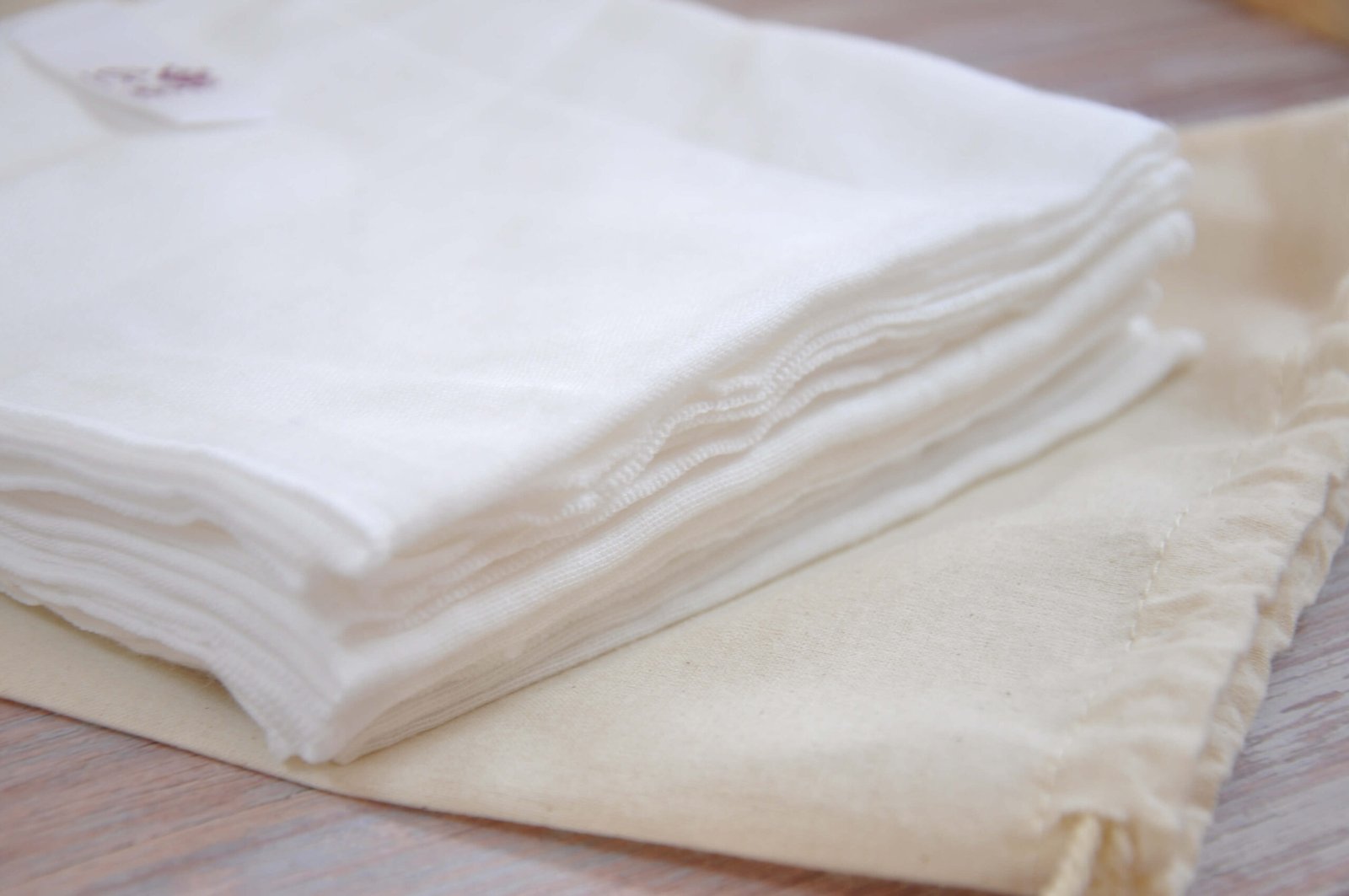 A pack of 8 unbleached muslin 100% cotton face flannels. This is enough for a week and a spare. They are purposely light in colour, so you get the satisfaction of seeing the dirt/makeup come off.